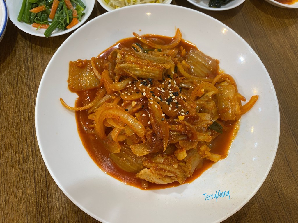 泡菜炒五花肉. 普普. 泡菜好酸, 肉少少的, 還很硬. 小孩看到滿滿的洋蔥, 臉都垮了.