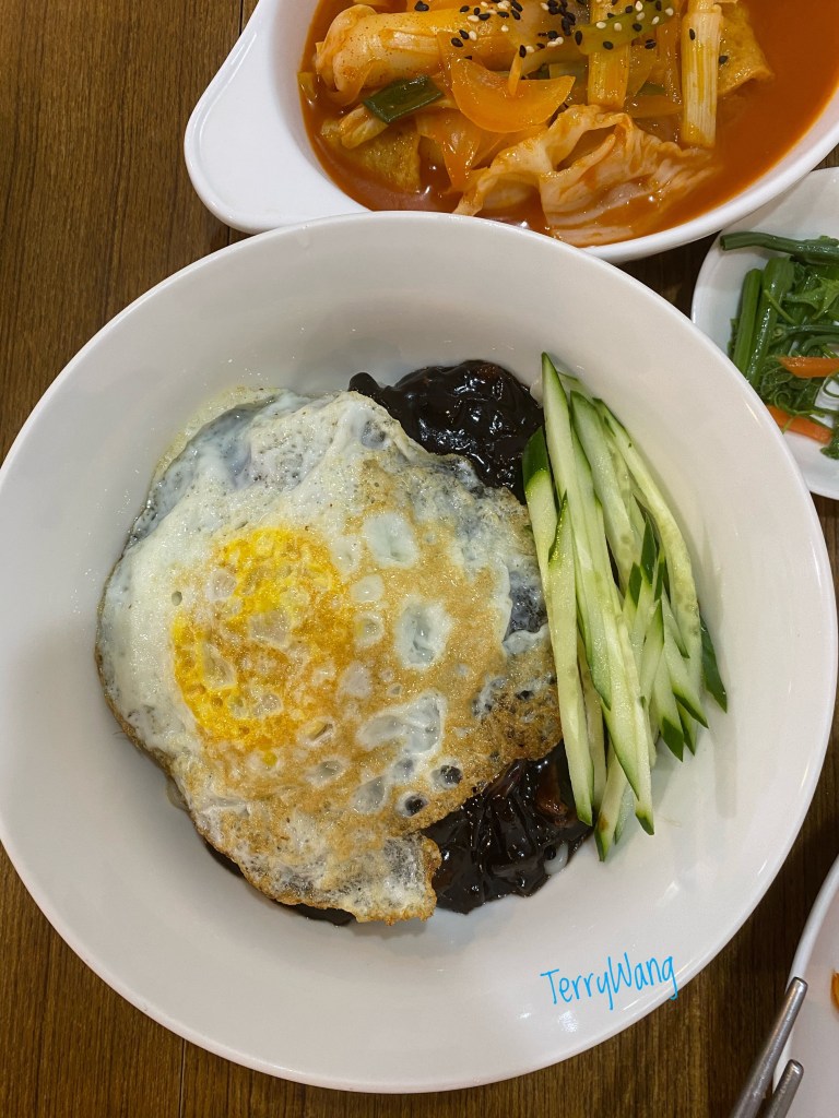 炸醬麵. 看韓國影集裡, 他們的警察常點炸醬麵, 圍著一個小桌子, 西哩呼嚕就吃起來. 菜單上看到這道麵, 想也不想, 就點.